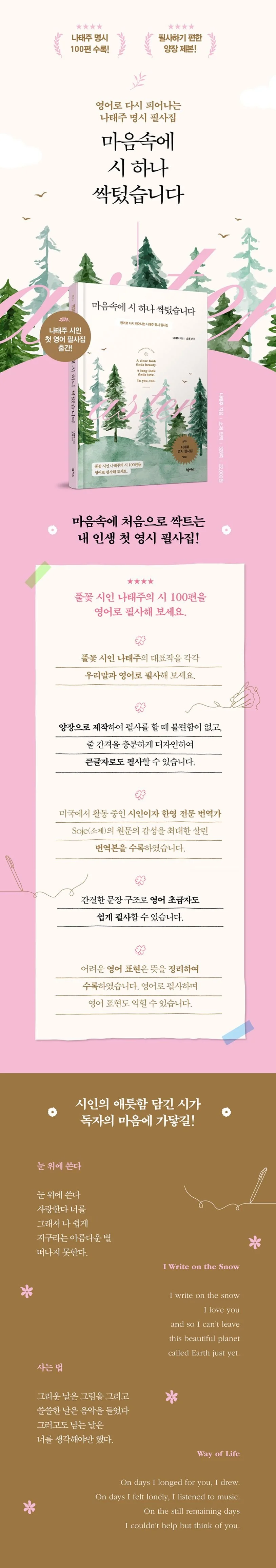 It is a book that transcribes poetry by poet Na Tae-joo. You can also transcribe it in English through the translation of Soje, a poet and professional translator in the United States. I tried to convey the sensitivity of the original text as much as possible, and it is at an English level that even beginners in English can easily transcribe. A total of 100 pieces, including "Flower," which is a representative work of poet Na Tae-joo, are included, and they are made of hardcover so that they can be transcribed conveniently.