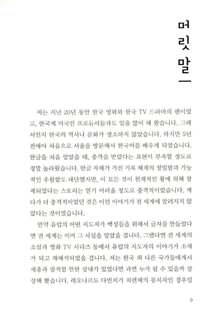 1996년 세종대왕 탄신 600주년을 맞아 일본인 천문학자 와타나베씨가 발견한 'QV1'이라는 소행성에 'SEJONG'이라는 이름을 붙여 세계 천문학계에 공포했다는 사실을 최근에야 알게 되었다. 이 소행성이 '세종'이라는 이름을 갖게 된 것은 세종대왕에 대해 누구보다 조예가 깊은 도쿄천문대 기치로 후루카와 교수의 강력한 추천이었다고 한다. 자연과학사에 남긴 세종대왕의 업적을 세계 천문학계에서도 인정한다는 뜻이다. 조메노스키 작가의 『킹세종』을 읽으며 소행성 ‘세종’이 묘하게 겹쳤다. SF TV드라마 대본과 시나리오를 집필한 작가답게 특유의 상상력이 재미있는 농담과 함께 생생한 구어체 표현으로 영화의 장면이 펼쳐지듯 스토리를 더욱 공고히 한다. 영어가 모국어인 작가가 영어로 쓴 최초의 한국역사판타지 소설이 이제 전세계인에게 소개되고 드라마까지 만들어져 세종대왕과 한글이 알려진다는 사실이 가슴을 뛰게 했다. 우리에게는 한글창제 과정이 너무도 익숙하지만 외국인인 작가에게는 정말 신기하고 대단한 일인 것이다. 작가가 마치 소행성 ‘세종’을 안드로메다에서 지구로 소환해 전세계인에게 알리는 느낌이다. 지금보다 더 많이 한글이 알려져 세계인이 한글을 즐겨 쓰게 되길 소망한다.