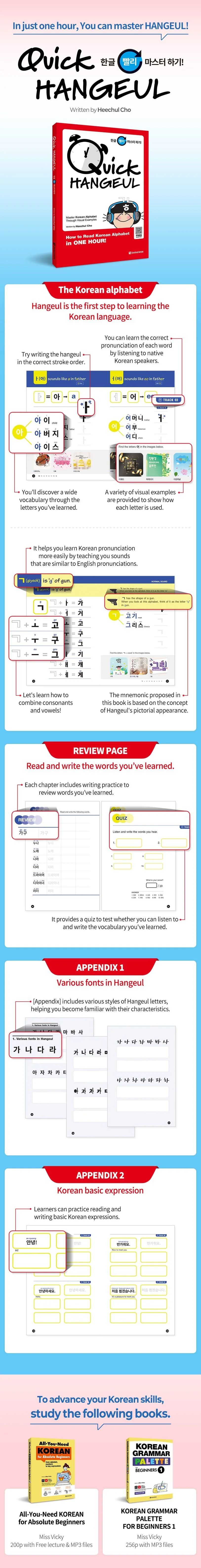 This book presents a new way to memorize Hangeul with images and focuses on learning Hangeul so you can read and write with confidence! The mnemonic proposed in this book is based on the concept of Hangeul's pictorial appearance. You can learn shapes and sounds of consonants and vowels through visual examples.